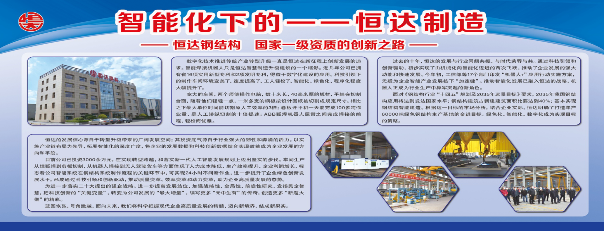 山西恒達鋼結(jié)構(gòu)工程有限公司始建于1998年,位于國家歷史文化名城、晉商故里——山西祁縣,緊鄰208國道,坐落于省級經(jīng)濟開發(fā)區(qū),毗鄰喬家大院景區(qū),地理環(huán)境優(yōu)越,交通十分便利。現(xiàn)有廠區(qū)占地面積200余畝,建筑面積60000平方米。 我公司是一家從事研發(fā)、銷售、制造和施工于一體的大型鋼結(jié)構(gòu)工程企業(yè),同時也是涂鍍鋼品及配套建筑圍護材料系統(tǒng)的專業(yè)生產(chǎn)廠商。多年來,逐漸確立了以商務寫字樓、賓館、高層住宅等為主的高層鋼結(jié)構(gòu)建筑體系,以大型煤倉、高鐵車站、體育場館等公共建筑為主的空間大跨度鋼結(jié)構(gòu)建筑體系,以工業(yè)廠房、低溫物流庫、多層鋼結(jié)構(gòu)建筑等為主的輕鋼結(jié)構(gòu)建筑體系。 我公司現(xiàn)擁有數(shù)條輕鋼結(jié)構(gòu)加工生產(chǎn)線、重型鋼結(jié)構(gòu)加工生產(chǎn)線、箱型梁柱加工生產(chǎn)線,同時配套有全自動巖棉保溫復合板生產(chǎn)線、高鐵聲屏障、抑風墻生產(chǎn)線,數(shù)控C型鋼生產(chǎn)線及各種規(guī)格的壓型板生產(chǎn)線三十余條,擁有年鋼結(jié)構(gòu)加工8萬噸、鋼結(jié)構(gòu)圍護面積120萬平方米的生產(chǎn)能力, [ 查看詳情 ]
